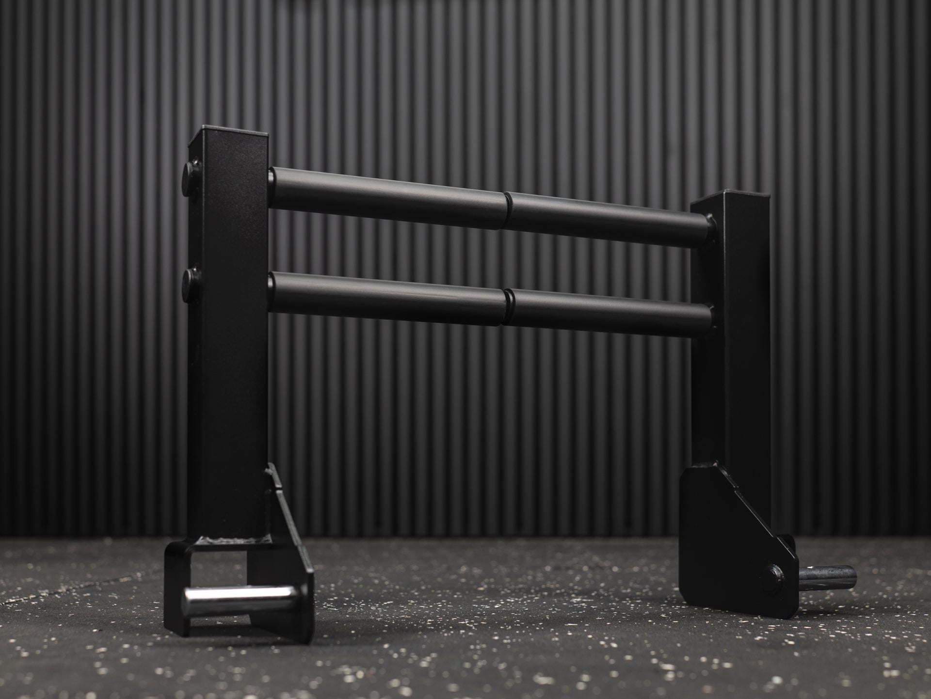 Mit der Dip Handle Ergänzung Smith Machine SQMIZE® R741DH XT Professional wird die Smith Machine SQMIZE® POWER PACK R741 XT Professional um eine Dipstation erweitert. Die beiden Handles werden einfach links und rechts in die Säulen des Half Racks der R741 XT eingesteckt. Ein weiterer Vorteil sind die zwei Griffe pro Seite. Durch die zwei unterschiedlichen Griffweiten kann das Training gezielt auf die Trizepsmuskulatur mit engem, neutralem Griff oder auf die Brustmuskulatur mit weitem, neutralem Griff ausgerichtet werden.