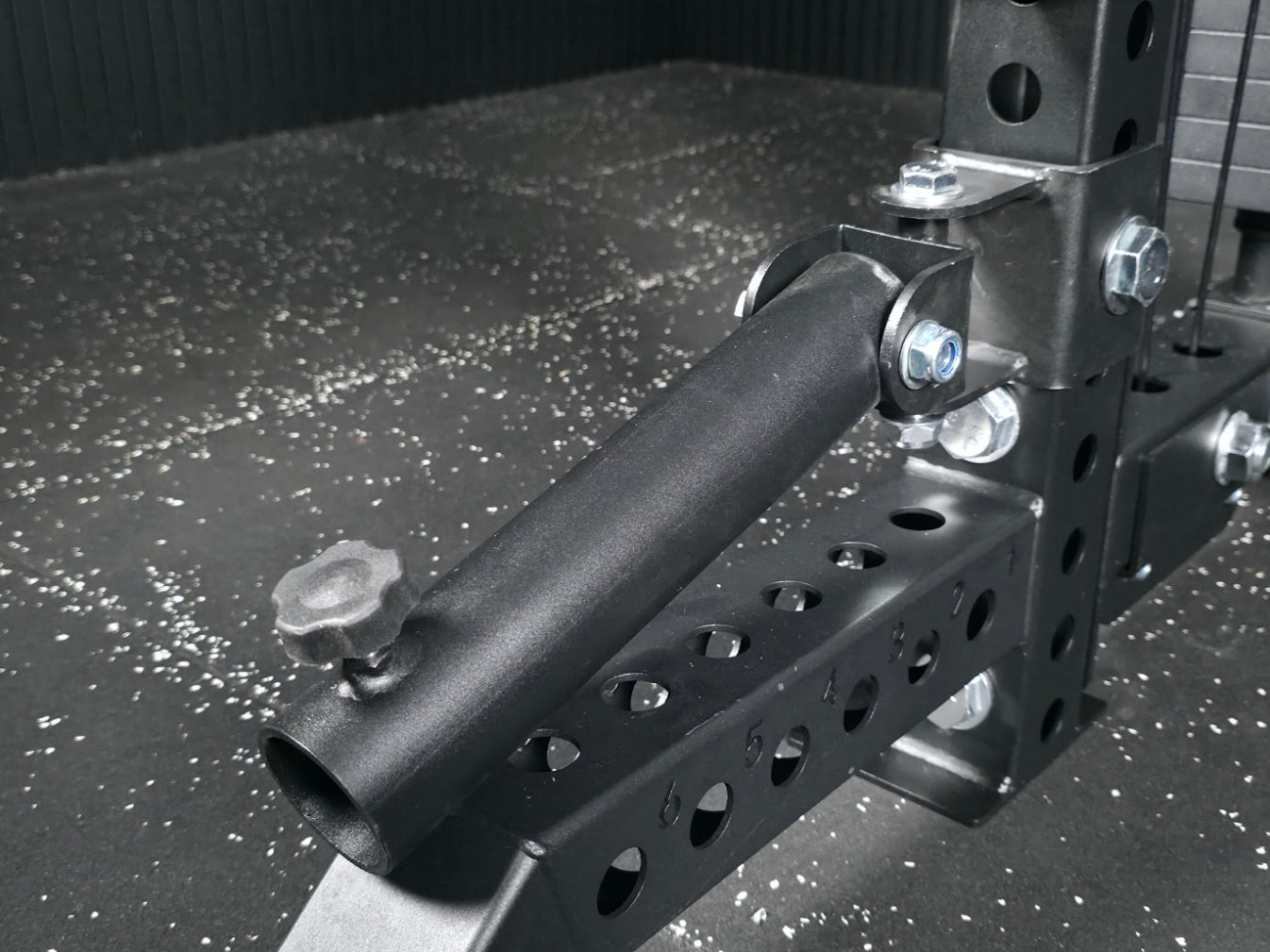 SQ-S955-BH Bar Holder: Vertikaler Halter zur platzsparenden Aufbewahrung einer 50 mm Hantelstange direkt am Rack.